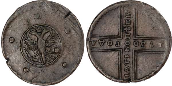 Russia, Empire. Anna Ivanovna CU 5 Kopeck. Kadashevsky mint, 1730. Crowned double-headed eagle facing, holding sceptre and orb; crown above, M-Д across lower fields; all within dotted circular border, five pellets (mark of value) around / Denomination and date within cross. Bitkin -, cf. 250-257. 20.89g, 33mm, 75.