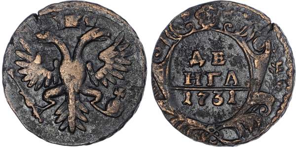 Russia, Empire. Anna Ivanovna CU Denga (1/2 Kopeck). Red mint, 1731. Crowned double-headed eagle facing, holding sceptre and orb; crown above / Elaborately ornamented cartouche inscribed with denomination and date. Bitkin -, cf. 281 for obv. die & 286 for rev. die. 8.11g, 25mm, 11h.