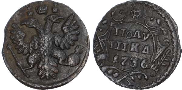 Russia, Empire. Anna Ivanovna CU Polushka (1/4 Kopeck). Flatting Mill on the Yauza River mint, 1736. Crowned double-headed eagle facing, holding sceptre and orb; crown above / Elaborately ornamented cartouche inscribed with denomination and date. Bitkin 356 (same rev. die). 3.67g, 20mm, 12h.
