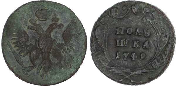 Russia, Empire. Elizabeth CU Polushka (1/4 Kopeck). Red mint, 1749. Crowned double-headed eagle facing, holding sceptre and orb; crown above / Elaborately ornamented cartouche inscribed with denomination and date. Bitkin 376. 4.04g, 21mm, 12h.