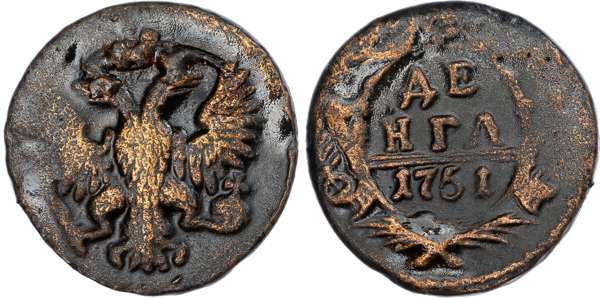 Russia, Empire. Elizabeth CU Denga (1/2 Kopeck). Ekaterinburg mint, 1751. Crowned double-headed eagle facing, holding sceptre and orb; crown above / Elaborately ornamented cartouche inscribed with denomination and date. Bitkin 418. 8.37g, 25mm, 12h.