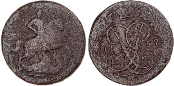 Russia, Empire. Elizabeth CU 2 Kopeck. Ekaterinburg mint, 1757. St. George on horseback to right, slaying dragon with spear, denomination on scroll below / Crowned monogram, date across fields, all within wreath. Edge inscription EKATEPNHbVPCKOrO ❉ABOPA❉ Bitkin 467. 21.17g, 30mm, 11h.