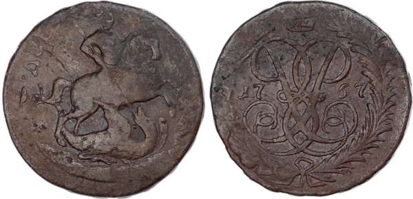 Russia, Empire. Elizabeth CU 2 Kopeck. Ekaterinburg mint, 1757. St. George on horseback to right, slaying dragon with spear; denomination above / Crowned monogram, date across fields; all within wreath. Edge inscription: EKATEPИHБƔPCKOГO ✿ ДВОРА ✿. Bitkin 443. 20.53g, 31mm, 12h.