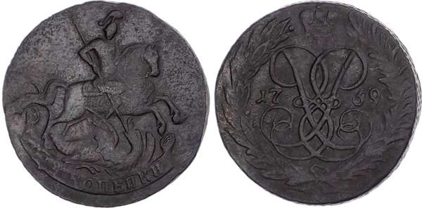 Russia, Empire. Elizabeth CU 2 Kopeck. Red mint, 1759. St. George on horseback to right, slaying dragon with spear; denomination on scroll below / Crowned monogram, date across fields; all within wreath. Bitkin 393. 22.07g, 32mm, 12h.