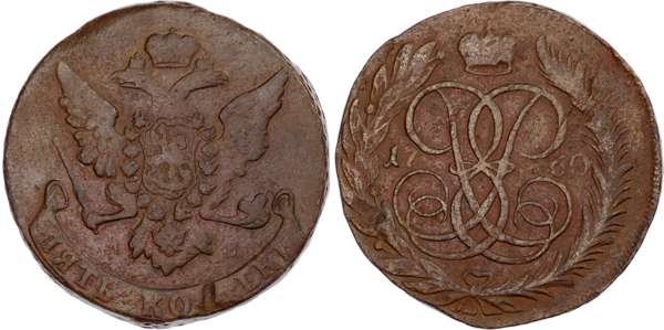 Russia, Empire. Elizabeth CU 5 Kopeck. Red mint, 1760. Crowned double-headed imperial eagle facing, wearing shield on breast depicting St. George slaying the dragon, and holding sceptre and orb; crown above, M-M across lower fields, denomination in scroll below / Crowned monogram within wreath; date across fields. Bitkin 389. 53.35g, 42mm, 12h.