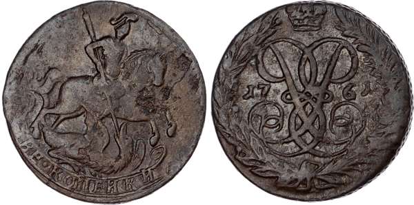 Russia, Empire. Elizabeth CU 2 Kopeck. Red mint, 1761. St. George on horseback to right, slaying dragon with spear; denomination on scroll below / Crowned monogram within wreath; date across fields. Bitkin 395. 19.96g, 31mm, 12h.