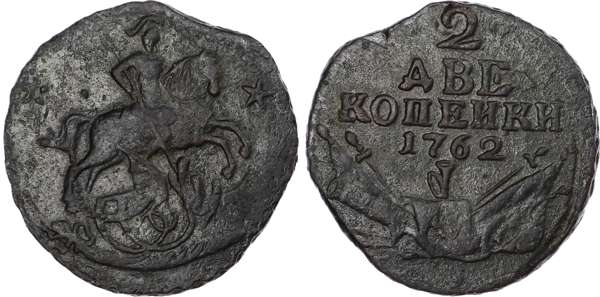 Russia, Empire. Peter III CU 2 Kopeck. Uncertain mint, 1762. St. George on horseback to right, slaying dragon with spear; two stars around / Denomination and date above pile of arms, pennants and instruments. Bitkin -, cf. 31-35. 9.11g, 21mm, 12h.