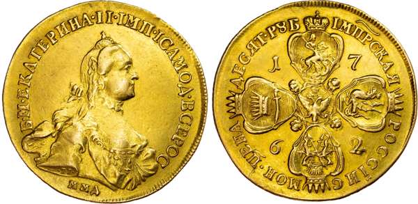 Russia, Empire. Catherine II AV 10 Rouble. Red mint, 1762. Б • М • ЕКАТЕРИНА • II • ІМП • IСАМОД • ВСЕРОС, crowned and draped bust to right; •T•I• on arm truncation, MMД below / IМПРСКАЯ РОССIЙС МОН • ЦЕНА ДЕСЯТ • РƔБ, crowned coats-of-arms of four Tsardoms, with central ornamented coat-of-arms of Russian Empire; date in quarters. Bitkin 1. 16.41g, 33mm, 12h.