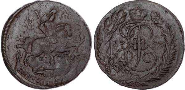Russia, Empire. Catherine II CU 2 Kopeck. Ekaterinburg mint, 1763. St. George on horseback to right, slaying dragon with spear; E-M across fields, denomination on scroll below / Crowned monogram, date across fields; all within wreath. Edge inscription illegible. Bitkin 663. 20.88g, 34mm, 12h.
