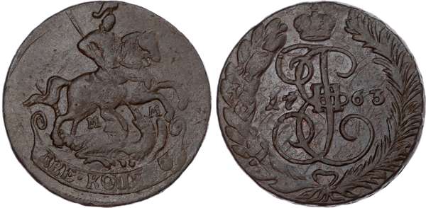 Russia, Empire. Catherine II CU 2 Kopeck. Red mint, 1763. St. George on horseback to right, slaying dragon with spear; M-M across fields, denomination on scroll below / Crowned monogram within wreath; date across fields. Bitkin 531. 20.56g, 31mm, 12h.