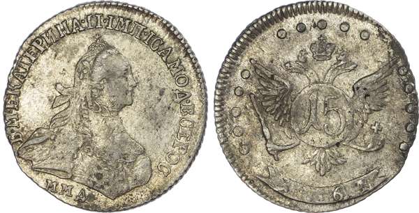 Russia, Empire. Catherine II AR 15 Kopeck. Red mint, 1764.