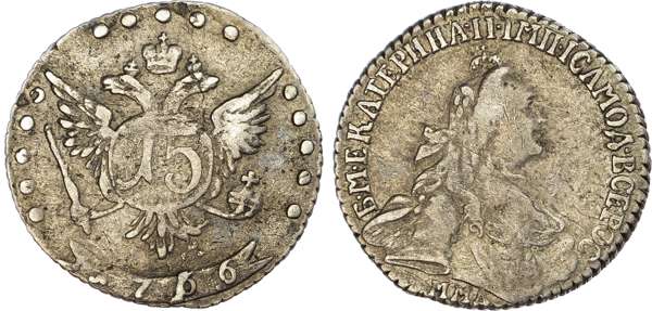 Russia, Empire. Catherine II AR 15 Kopeck. Red mint, 1766.