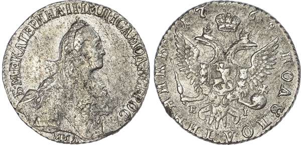 Russia, Empire. Catherine II AR Polupoltinnik (25 Kopeck). Red mint, 1769. Egor Ivanov, mintmaster. Б • М • ЕКАТЕРИНА • II • IМП • I САМОД • ВСЕРОС, crowned and draped bust to right; MMД below / Crowned double-headed eagle facing with wings spread, wearing shield on breast depicting St. George slaying the dragon, and holding sceptre and orb; crown above, E-I in lower fields, denomination and date around. Bitkin 145. 6.22g, 23mm, 12h.