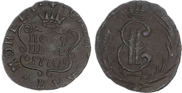 Russia, Empire. Catherine II CU Polushka (1/4 Kopeck). Suzun mint, 1770. Crowned monogram, К-M across lower fields; all within wreath / • СИБИРСКАЯ • МОНЕТА •, crowned cartouche inscribed with denomination and date; cross above. Bitkin 1214. 1.31g, 17mm, 11h.