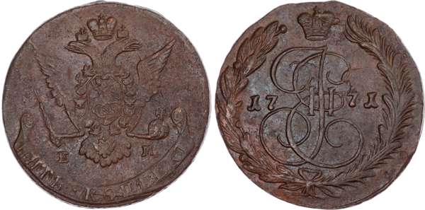 Russia, Empire. Catherine II CU 5 Kopeck. Ekaterinburg mint, 1771. Crowned double-headed eagle facing with wings spread, wearing shield on breast depicting St. George slaying the dragon, and holding sceptre and orb; crown above, E-M across lower fields, denomination on scroll below / Crowned monogram, date across fields; all within wreath. Bitkin 620a. 47.67g, 42mm, 12h.