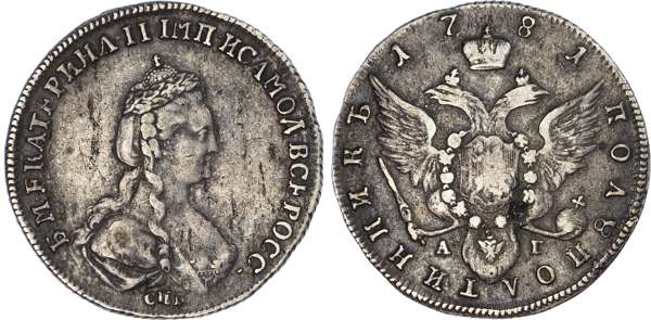 Russia, Empire. Catherine II AR Polupoltinnik (25 Kopeck). St. Petersburg mint, 1781. Б • М • ЕКАТЕРИНА • II • IМП • И САМОД • ВСЕРОСC•, crowned and draped bust to right; СПБ below / Crowned double-headed eagle facing with wings spread, wearing shield on breast depicting St. George slaying the dragon, and holding sceptre and orb; crown above, A-Г in lower fields, denomination and date around. Bitkin 332. 5.20g, 24mm, 12h.