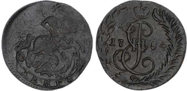 Russia, Empire. Catherine II CU Denga (1/2 Kopeck). Suzun mint, 1784. St. George on horseback to right, slaying dragon with spear; К-M across fields, denomination on scroll below / Crowned monogram, date across fields; all within wreath. Bitkin 820. 4.80g, 22mm, 12h.
