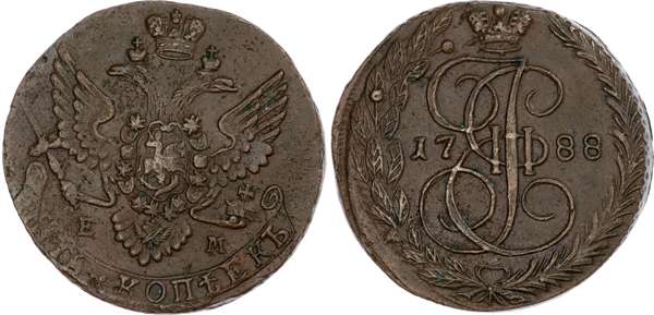 Russia, Empire. Catherine II CU 5 Kopeck. Ekaterinburg mint, 1788. Crowned double-headed eagle facing with wings spread, wearing shield on breast depicting St. George slaying the dragon, and holding sceptre and orb; crown above, E-M across lower fields, denomination on scroll below / Crowned monogram, date across fields; all within wreath. Bitkin 642. 58.08g, 42mm, 12h.
