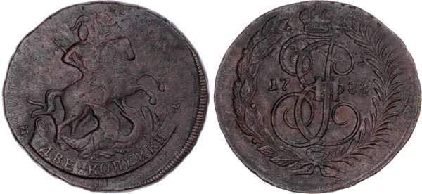 Russia, Empire. Catherine II CU 2 Kopeck. Red mint, 1788. St. George on horseback to right, slaying dragon with spear; M-M across fields, denomination on scroll below / Crowned monogram, date across fields; all within wreath. Bitkin 537. 20.40g, 33mm, 12h.
