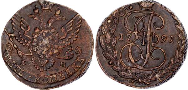 Russia, Empire. Catherine II CU 5 Kopeck. Ekaterinburg mint, 1791. Crowned double-headed imperial eagle facing, wearing shield on breast depicting St. George slaying the dragon, and holding sceptre and orb; crown above, E-M across lower fields, denomination in scroll below / Crowned monogram within wreath; date across fields. Bitkin 645. 51.53g, 42mm, 12h.