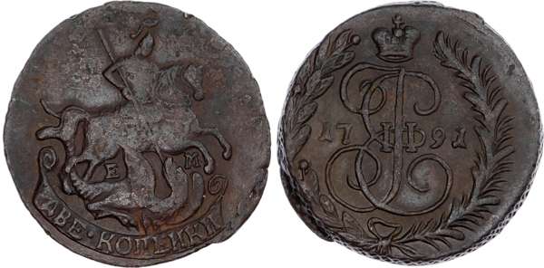 Russia, Empire. Catherine II CU 2 Kopeck. Ekaterinburg mint, 1791. St. George on horseback to right, slaying dragon with spear; E-M across fields, denomination on scroll below / Crowned monogram within wreath; date across fields. Bitkin 684. 21.95g, 33mm, 12h.