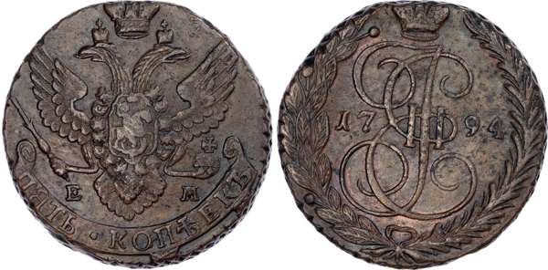 Russia, Empire. Catherine II CU 5 Kopeck. Ekaterinburg mint, 1794. Crowned double-headed eagle facing with wings spread, wearing shield on breast depicting St. George slaying the dragon, and holding sceptre and orb; crown above, E-M across lower fields, denomination on scroll below / Crowned monogram, date across fields; all within wreath. Bitkin 648. 56.30g, 42mm, 12h.