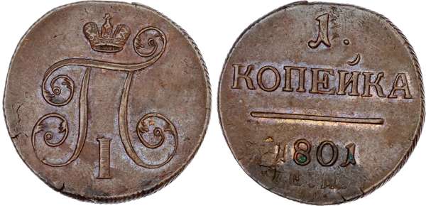 Russia, Empire. Paul I CU Kopeck. Ekaterinburg mint, 1801.