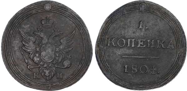 Russia, Empire. Alexander I CU Kopeck. Suzun mint, 1804. Crowned double-headed eagle facing with wings spread, wearing shield on breast depicting St. George slaying the dragon, and holding sceptre and orb; crown above, К-M across lower fields / Denomination over date. Bitkin 443. 10.73g, 29mm, 12h.