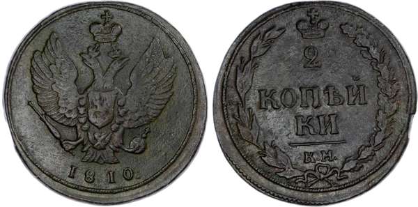 Russia, Empire. Alexander I CU 2 Kopeck. Suzun mint, 1810. Crowned double-headed eagle facing with wings spread, wearing shield on breast depicting St. George slaying the dragon, and holding sceptre and orb; crown above, date below / Denomination above К.M.; crown above, wreath around. Bitkin 477. 15.70g, 31mm, 12h.
