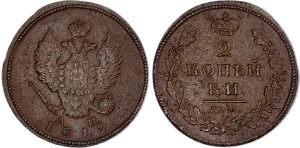 Russia, Empire. Alexander I CU 2 Kopeck. Suzun mint, 1812. Alexey Maleev or Andrey Mevius, mintmaster. Crowned double-headed eagle facing with wings spread, wearing shield on breast depicting St. George slaying the dragon, and holding sceptre and orb; crown above, A-M across lower fields, date below / Denomination above K.M.; crown above, wreath around. Bitkin 487. 13.62g, 29mm, 12h.