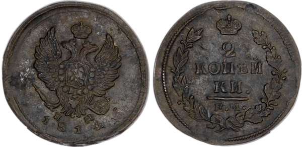 Russia, Empire. Alexander I CU 2 Kopeck. Ekaterinburg mint, 1814