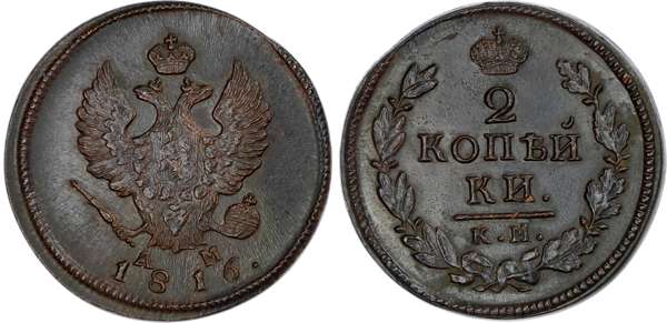 Russia, Empire. Alexander I CU 2 Kopeck. Suzun mint, 1816. Crowned double-headed eagle facing with wings spread, wearing shield on breast depicting St. George slaying the dragon, and holding sceptre and orb; crown above, A-M across lower fields, date below / Denomination above К.M.; crown above, wreath around. Bitkin 495. 14.29g, 30mm, 12h.