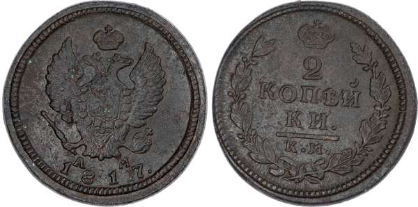 Russia, Empire. Alexander I CU 2 Kopeck. Suzun mint, 1817. Alexey Maleev or Andrey Mevius, mintmaster. Crowned double-headed eagle facing with wings spread, wearing shield on breast depicting St. George slaying the dragon, and holding sceptre and orb; crown above, A-M across lower fields, date below / Denomination above К.M.; crown above, wreath around. Bitkin 497. 16.12g, 30mm, 12h.