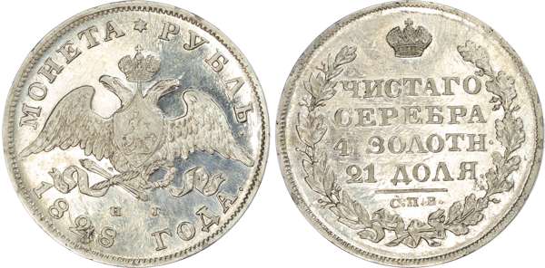 Russia, Empire. Nicholas I AR Rouble. St. Petersburg mint, 1828. Double-headed eagle facing, wings spread, shield on breast, holding ribbon & wreath with crossed thunderbolt and torch, crown above, H-r, denomination and date above and below in cyrillic text / ЧИСТАГО СЕРЕБРА4 ЗОЛОТН∙ 21 ДОЛЯ. in four lines,С.П.Б. within wreath, crown above. Bitkin 106. 20.73g, 35.5mm, 12h.