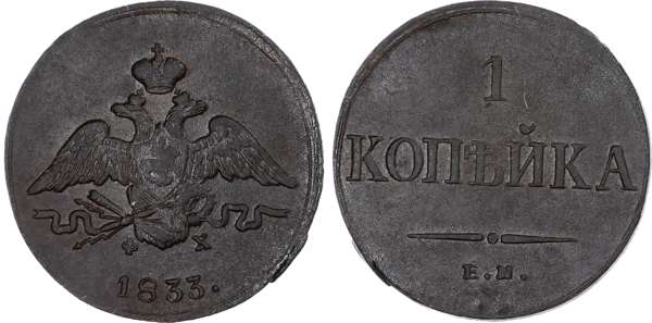 Russia, Empire. Nicholas I CU Kopeck. Ekaterinburg mint, 1833. Crowned double-headed eagle facing with wings spread, wearing shield on breast depicting St. George slaying the dragon, and holding ribboned wreath and crossed thunderbolt and torches; crown above, Ф-Х across lower fields, date below / Denomination above E.M. Bitkin 520. 5.00g, 25mm, 12h.