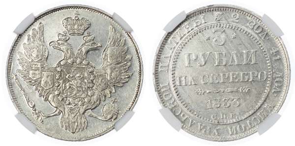 Russia, Empire. Nicholas I PT 3 Rouble. St. Petersburg mint, 1833.