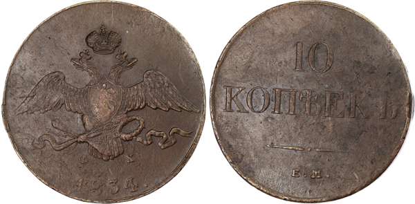 Russia, Empire. Nicholas I CU 10 Kopeck. Ekaterinburg mint, 1834. Fedor Hvoshinskiy, mintmaster. Crowned double-headed eagle facing with wings spread, wearing shield on breast depicting St. George slaying the dragon, and holding ribboned wreath and crossed thunderbolt and torches; crown above, Ф-X across lower fields, date below / Denomination above E.M. Bitkin 465. 40.72g, 44mm, 1h.