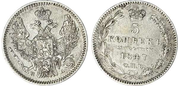 Russia, Empire. Nicholas I AR 5 Kopeck. St. Petersburg mint, 1847. ‡