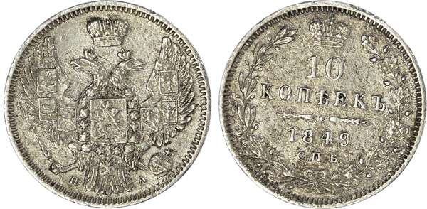Russia, Empire. Nicholas I AR 10 Kopeck. St. Petersburg mint, 1849. ‡