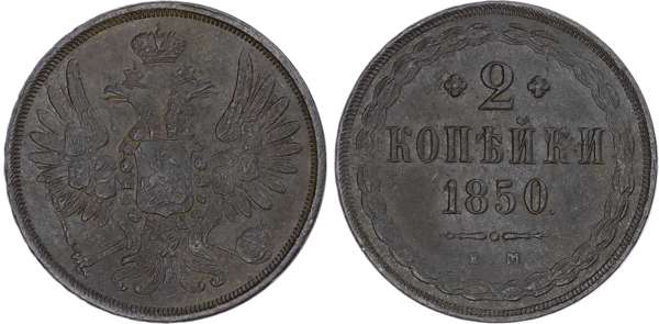 Russia, Empire. Nicholas I CU 2 Kopeck. Ekaterinburg mint, 1850. Crowned double-headed eagle facing with wings spread, wearing shield on breast depicting St. George slaying the dragon, with shields arranged across wings, and holding sceptre and orb; crown above / Denomination over date; E.M. below, wreath around. Bitkin 596. 10.03g, 28mm, 12h.