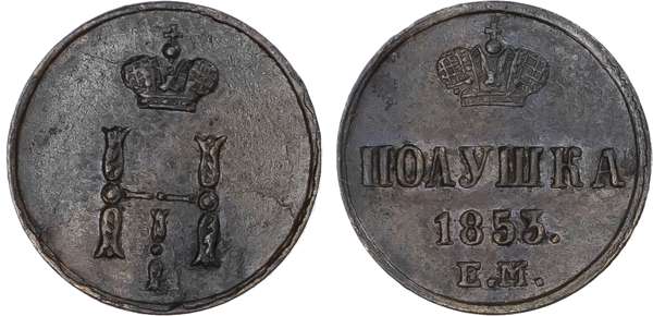 Russia, Empire. Nicholas I CU Polushka (1/4 Kopeck). Ekaterinburg mint, 1853. Crowned monogram / Denomination over date; crown above, E.M. below. Bitkin 624. 1.49g, 14mm, 12h.