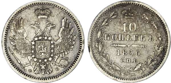 Russia, Empire. Alexander II AR 10 Kopeck. St. Petersburg mint, 1856. Crowned double-headed eagle facing with wings spread, wearing shield on breast depicting St. George slaying the dragon, with shields arranged across wings, and holding sceptre and orb; crown above, Ф-Б across lower fields / Denomination over date, C.П.Б. below; crown above and wreath around. Bitkin 63. 2.01g, 18mm, 12h.