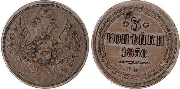 Russia, Empire. Alexander II CU 3 Kopeck. Ekaterinburg mint, 1856. Crowned double-headed eagle facing with wings spread, wearing shield on breast depicting St. George slaying the dragon, with shields arranged across wings, and holding sceptre and orb; crown above / Denomination over date; E.M. below, wreath around. Bitkin 318. 14.87g, 32mm, 12h.
