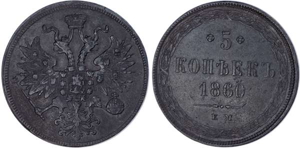 Russia, Empire. Alexander II CU 5 Kopeck. Ekaterinburg mint, 1860. ‡