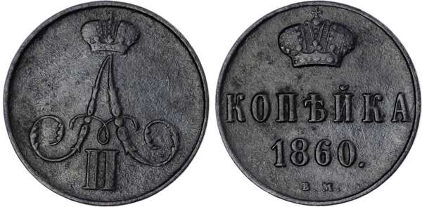 Russia, Empire. Alexander II CU Kopeck. Warsaw mint, 1860. ‡