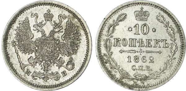 Russia, Empire. Alexander II AR 10 Kopeck. St. Petersburg mint, 1862. ‡