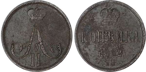Russia, Empire. Alexander II CU Kopeck. Warsaw mint, 1862. ‡