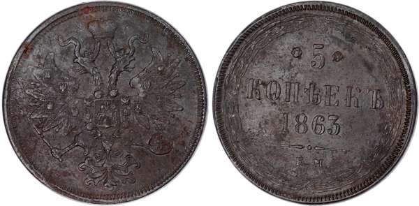 Russia, Empire. Alexander II CU 5 Kopeck. Ekaterinburg mint, 1863. ‡