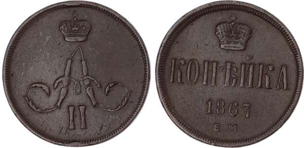 Russia, Empire. Alexander II CU Kopeck. Ekaterinburg mint, 1867. Crowned monogram / Denomination over date; crown above, E.M. below. Bitkin 362. 5.00g, 23mm, 12h.
