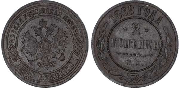 Russia, Empire. Alexander II CU 2 Kopeck. Ekaterinburg mint, 1869. Crowned double-headed eagle facing with wings spread, wearing shield on breast depicting St. George slaying the dragon, with shields arranged across wings, and holding sceptre and orb; crown with ribbons above, МѢДНАЯ РОССІИСКАЯ МОНЕТА and denomination in ornamented banner around / Denomination above E.M., surrounded by inner circle of pellets; date above and wreath around. Bitkin 414. 6.63g, 24mm, 12h.